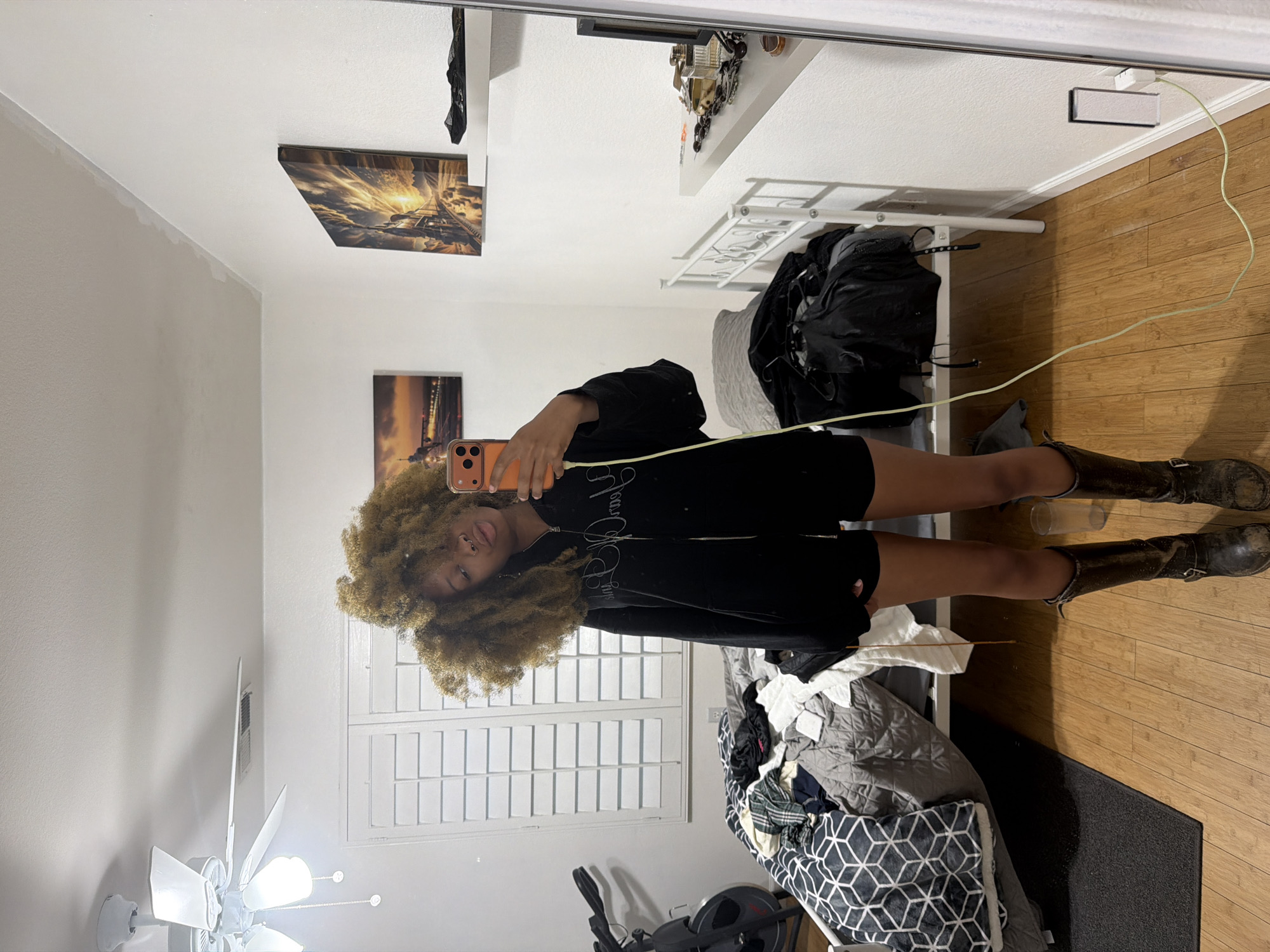 A person with curly hair wearing a black jacket and black shorts is taking a selfie in a mirror