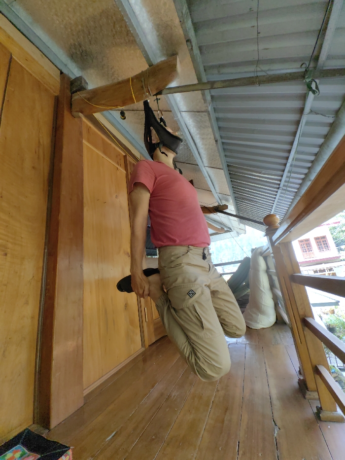An adult male is suspended by his head and neck in a black harness, which is connected via a yellow rope to a rough-hewn wooden beam. The beam is secured to a light-colored wooden wall or door frame. The male, wearing a red t-shirt and khaki cargo pants, is positioned with bent knees, his feet hovering just above a wooden plank floor. This scene occurs on an open-air balcony or porch in Mù Cang Chải, Vietnam. Overhead, a corrugated metal roof is visible. To the right, a wooden railing defines the balcony edge. Beyond the railing, green foliage, a large white cylindrical object, and multi-story buildings with red tiled roofs and multi-paned windows are observable, characteristic of a rural mountainous setting.