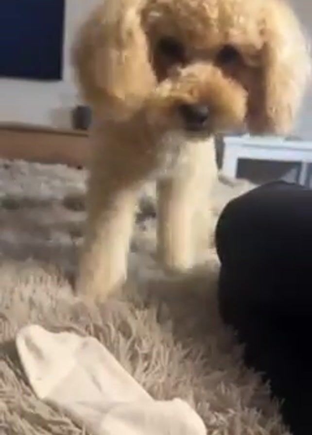 A small, tan poodle stands on a thick shag rug. The dog drops a white sock onto the rug, then looks at the camera and shakes its head slightly. There are two sofas and a table in the background. A black-clad leg is visible in the foreground. A plant and a painting hang on the wall.