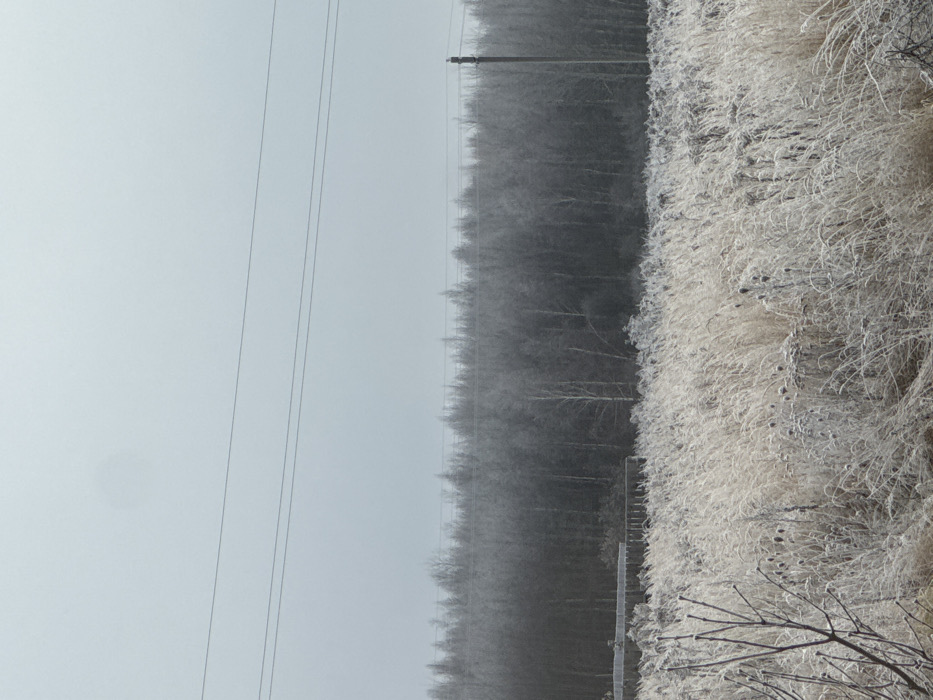 A hazy, winter landscape showcases frosted vegetation on the right side of the image. Adjacent to the frost-covered plants, a dark, dense forest stands tall. Power lines are visible on the left, against a pale, overcast sky. The scene evokes a cold, quiet atmosphere.