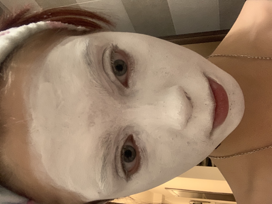A close-up, eye-level image depicts a person's face indoors. The individual's face is largely covered by a thick, white, opaque substance, consistent with a facial mask, extending from the hairline to the lower jaw, obscuring most skin features and the eyebrows. The eyes are open, with blue-gray irises looking directly forward, and the lower sclera exhibit a reddish tint. The lips are visible, colored dark reddish-maroon, and slightly parted. Reddish-brown hair is pulled back from the forehead by a light-colored, possibly patterned, headband. A thin, silver-colored chain necklace is visible against the person's bare, tan-toned neck and upper chest. The immediate background on the left reveals a light-colored wall with a darker, rectangular object, possibly a mirror or framed item, and on the right, a dark vertical element, such as a door frame. The environment appears to be an indoor room with artificial lighting. The specific location in the city of Budva, Montenegro, cannot be forensically determined from the visual information within the image.