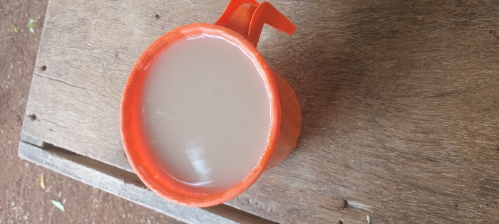 An orange plastic mug, filled with a milky liquid, rests on a weathered wooden surface. The mug features two handles, one visible. The liquid fills the mug almost to its brim. The wooden surface displays a rough texture with visible grain. The background is partially obscured, hinting at an outdoor setting. The lighting is soft, highlighting the texture of both the mug and the wood.
