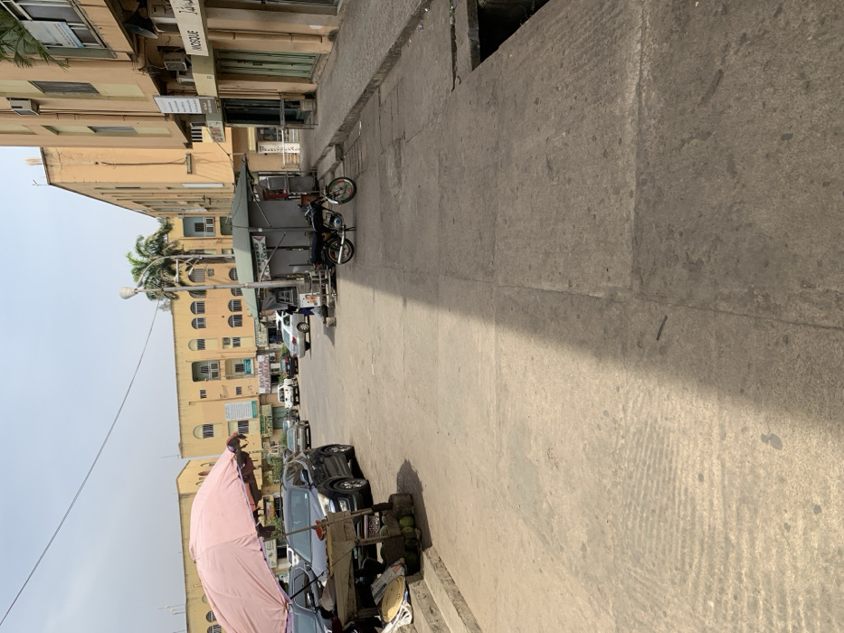The image captures a commercial street in Wuse Zone 4, Abuja, Nigeria, under bright daylight. The scene is viewed from a concrete sidewalk, looking down a paved street with multi-story buildings forming the background. In the foreground, on the left, a market stall is present, shaded by a large, faded pink umbrella. A pushcart beneath the umbrella displays several green, spherical items, likely coconuts. A dark-colored SUV is parked behind this stall. Concrete steps ascend from the left side of the foreground sidewalk. The concrete sidewalk spanning the foreground is worn, uneven, and marked with various patterns and discolorations. A sharp, dark shadow diagonally bisects the mid-ground of the sidewalk from the right. On the right side of the sidewalk, a small, grey kiosk with a slanted roof is visible. A black motorcycle with chrome accents on its handlebars and a red detail on its rear wheel is parked on its stand in front of this kiosk. Further to the right, an open drainage channel runs along the edge of the sidewalk parallel to the buildings. The street in the mid-ground is paved and accommodates several vehicles, including parked sedans and a white pickup truck. One individual, dressed in dark clothing, is partially visible standing near the kiosk on the right. The background is dominated by a row of three-to-four-story buildings featuring uniform light orange/tan facades with repetitive window designs, some arched. Commercial signs are visible on their ground floors, including "SKYMARK PHARMACY" and a sign bearing the word "MOSQUE" in both English and Arabic. A street light pole and a tall palm tree stand prominently in the mid-ground, behind the kiosk and motorcycle. The sky is clear and light blue.