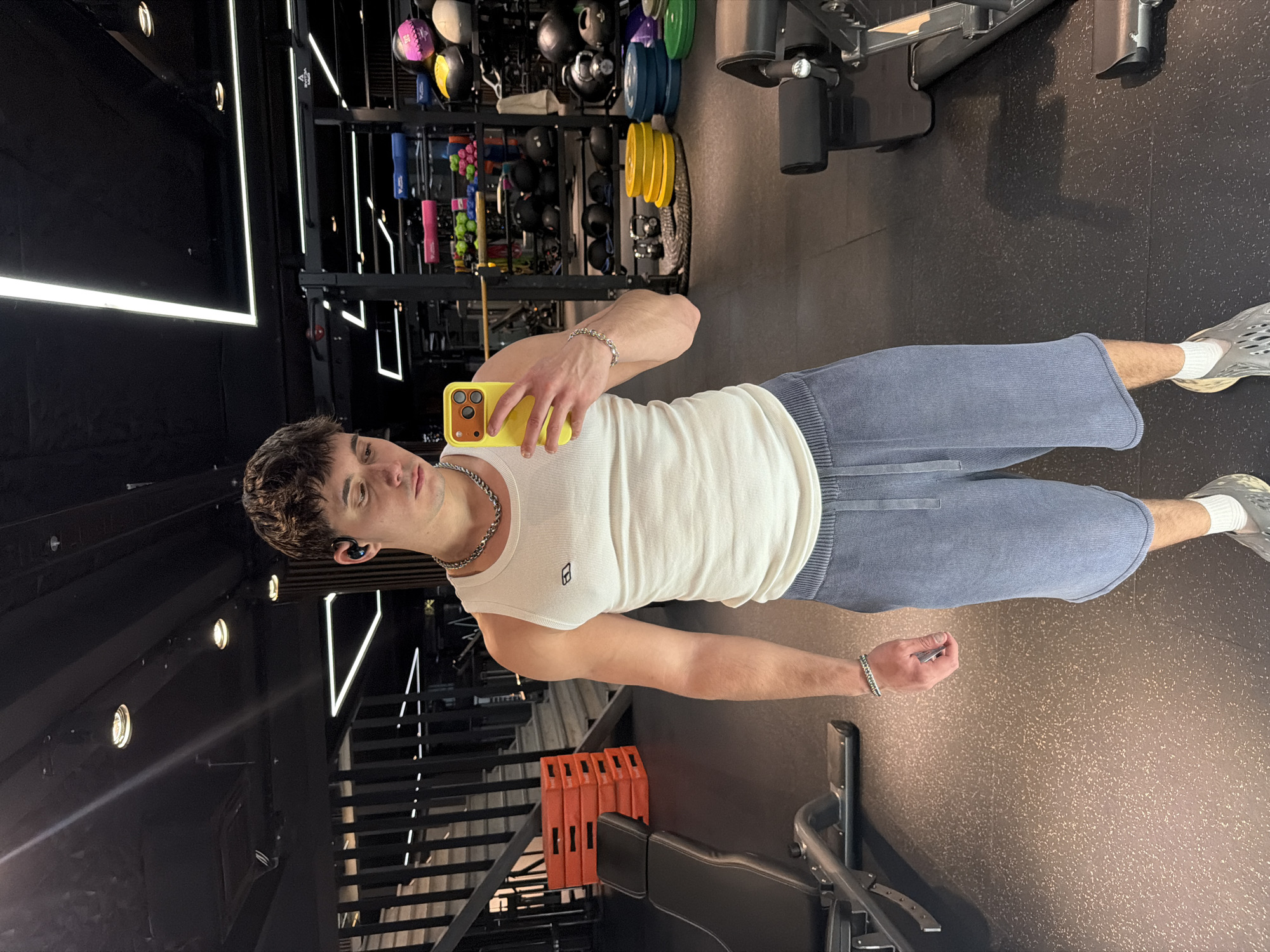 A young man is standing in a gym and taking a selfie with a yellow smartphone