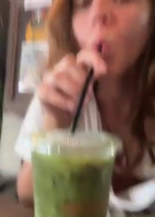 A young woman with brown hair and fair skin is drinking from a plastic cup filled with a green, iced beverage, using a black straw. She is wearing a white top with a lace-edged camisole underneath. She is sitting at a wooden table. In the background, there is a wall decorated with signs and posters. Her necklace is visible. The video appears to be shot indoors.