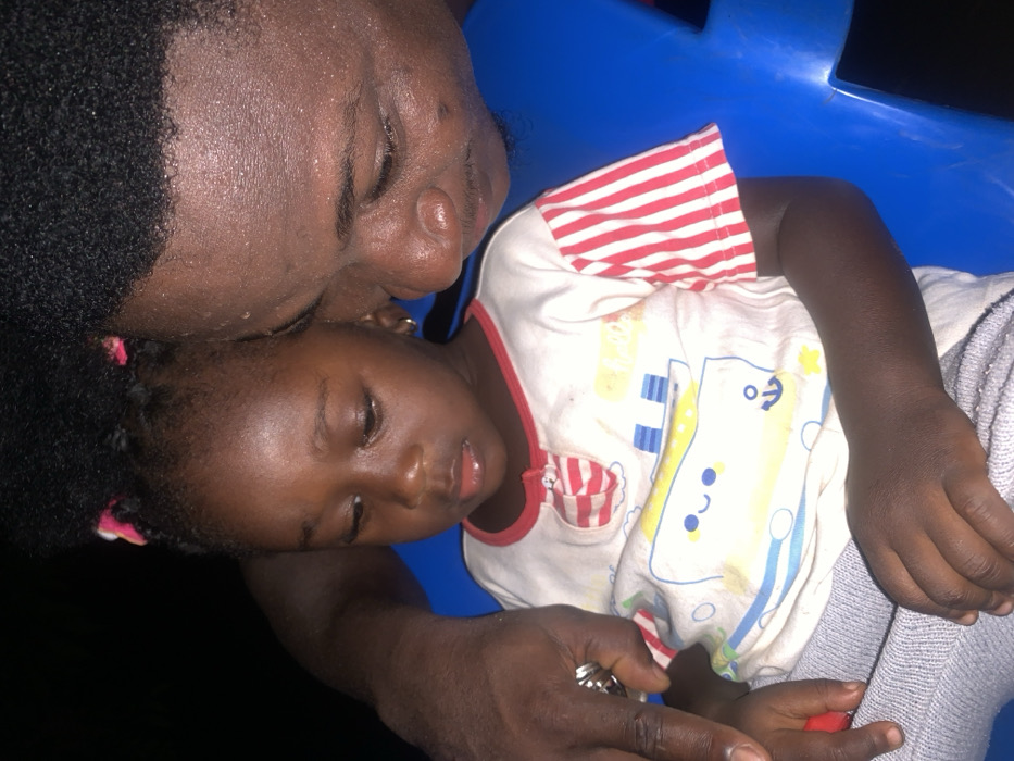 A man and child are laying together. The man is dark-skinned with short, curly hair and closed eyes. His head is near the child's. The child is also dark-skinned with hair pulled back with pink hair ties. The child’s eyes are closed. The child wears a white t-shirt with red and white striped sleeves. The child is laying on a gray knitted blanket. A blue surface is visible in the background. The man’s hand is visible with a ring on one finger.
