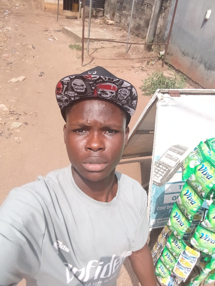 A young man in a gray t-shirt and a skull-patterned baseball cap takes a selfie. He stands near a white kiosk with a picture of a landline phone. The kiosk is stocked with "Viva Plus" drink packets. The background shows a dirt ground and weathered buildings. A metal structure stands partially visible behind him. The overall setting seems to be a simple, outdoor environment.