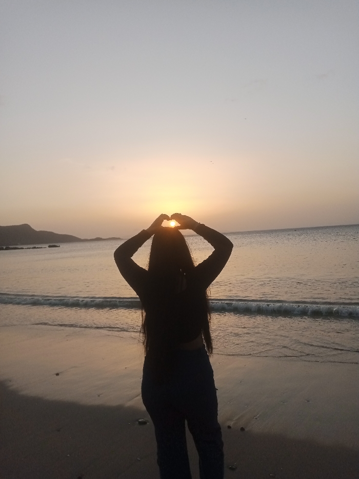 An individual, identifiable as female from a rear perspective, stands on a sandy beach in Juan Griego, Venezuela, during a sunset event