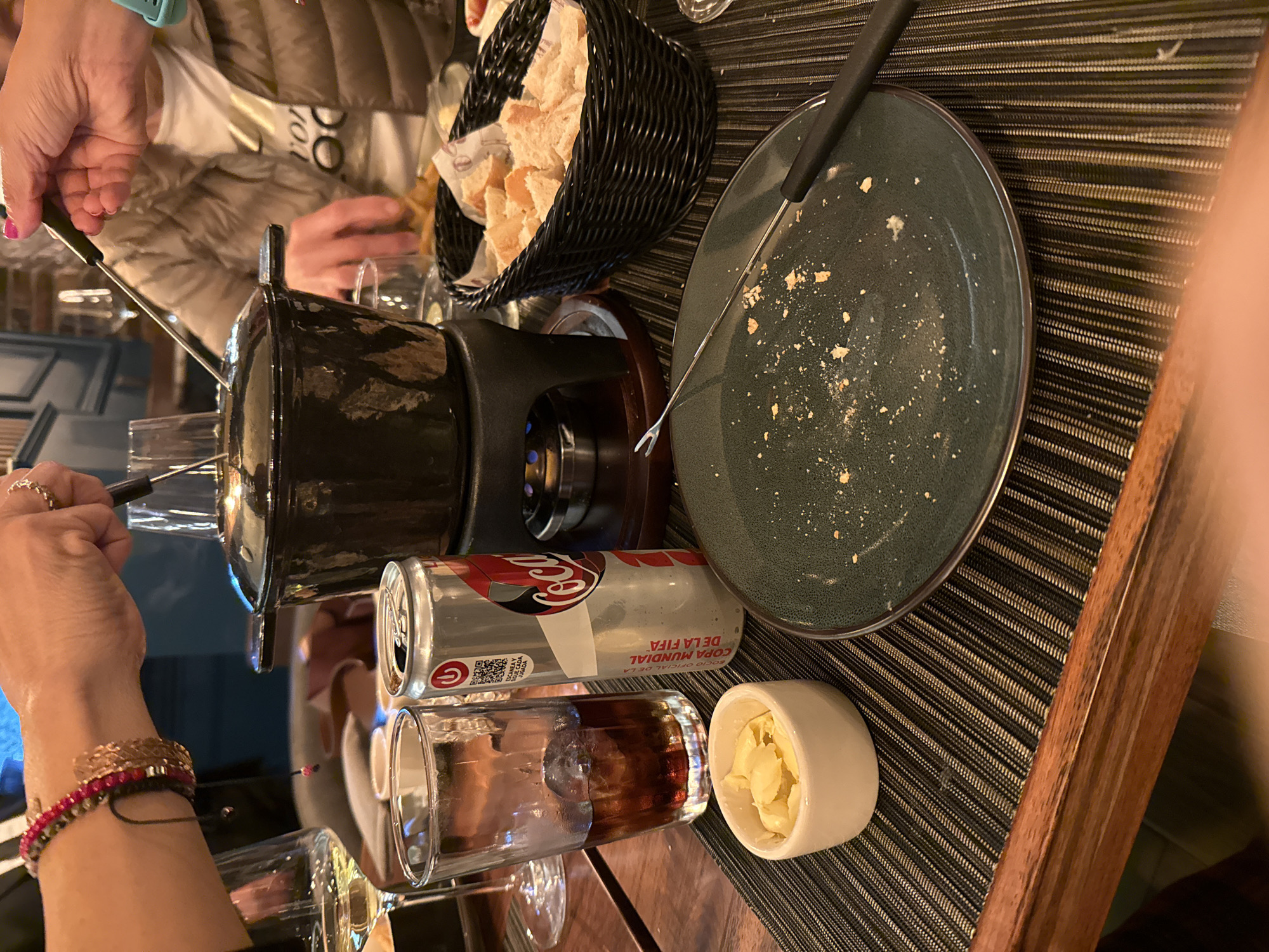 A fondue pot sits on a table surrounded by a plate with leftover food, a basket of bread, and a can of Coca-Cola labeled "COPA MUNDIAL DE LA FIFA SOCIO OFICIAL DE LA FIFA