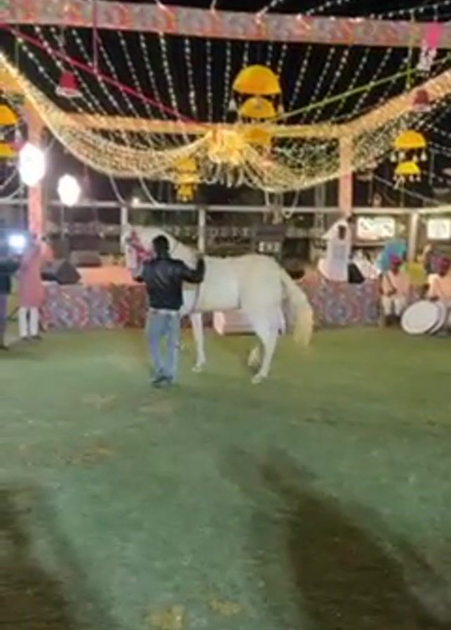 white horse being led in a grassy area decorated for an event, presumably a wedding. A man in a black jacket and jeans is holding the horse's reins. The area is decorated with string lights and colorful umbrellas hung overhead. There are other people in the background, some of whom appear to be musicians with drums. Someone is also taking photos. The scene appears to be outdoors at night, with festive lighting creating a celebratory atmosphere.