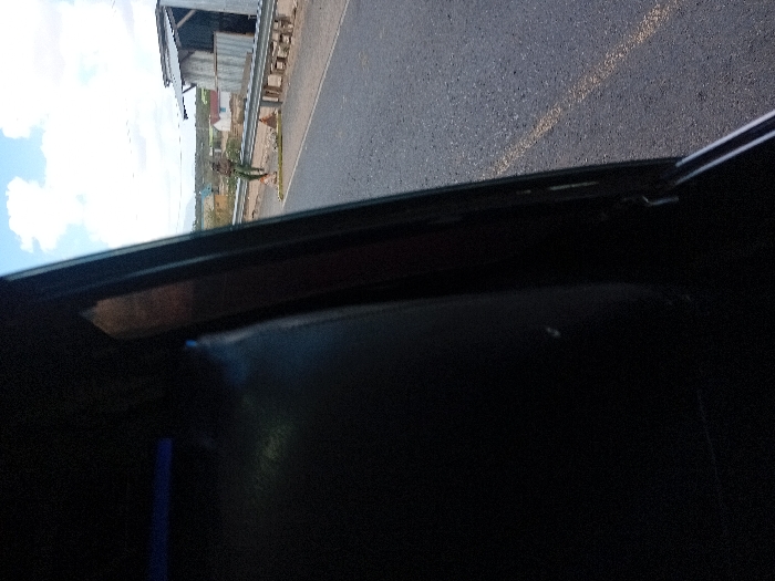 From inside a vehicle, a road with a yellow stripe curves along the outside. A person stands on the roadside next to a metal guardrail. Buildings are visible in the distance. The sky appears partly cloudy. The interior of the vehicle is dark, showing a headrest and the top of a seat.