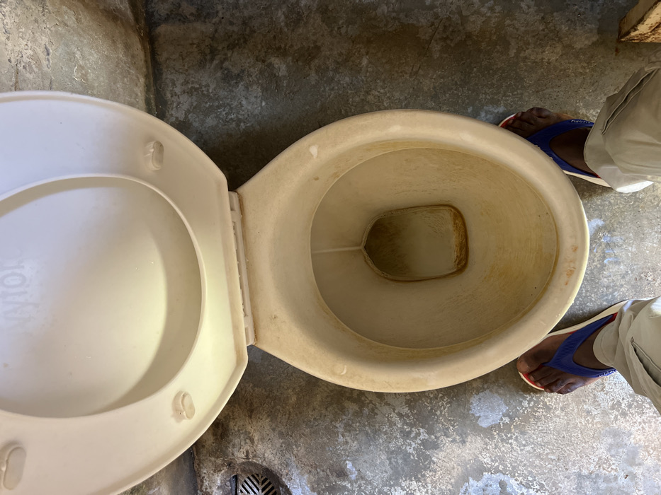 The image displays an overhead view of a cream-colored toilet bowl in a restroom located in Jos, Nigeria