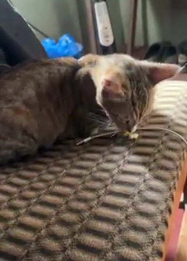- "The video depicts a tabby cat on a wooden stool with a checkered brown fabric seat, eating something small and yellow" by FM-dusYs1, licensed under CC BY 4.0