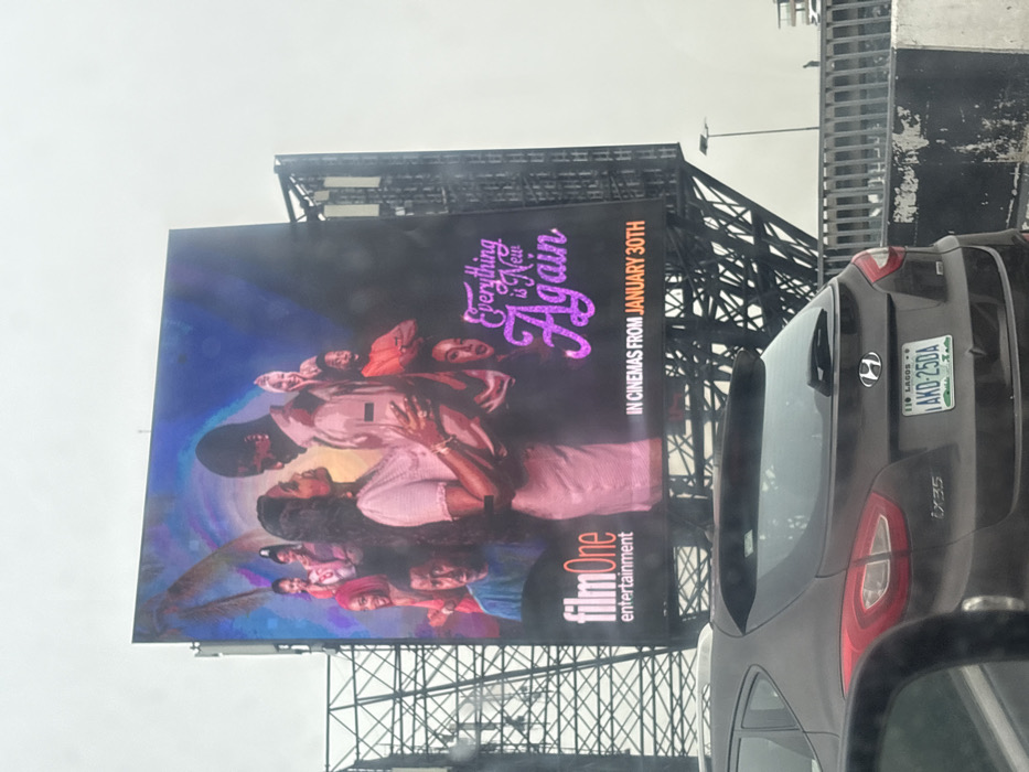 The scene depicts a large digital billboard positioned above an urban roadway in Falomo, Lagos, Nigeria, under an overcast sky. The billboard displays a movie poster for "Everything is New Again," produced by "filmOne entertainment," stating "IN CINEMAS FROM JANUARY 30TH." The poster prominently features a central man and woman embracing, both looking at each other, surrounded by several other individuals. The woman wears a pink dress, and the man a light-colored uniform. A dark grey Hyundai ix35 SUV occupies the foreground, its rear visible, with a Lagos license plate "AKD-25DA." The vehicle appears stationary in traffic on what seems to be a multi-lane road or bridge, bordered by a concrete barrier on the right. Structural metal trusses support the billboard.