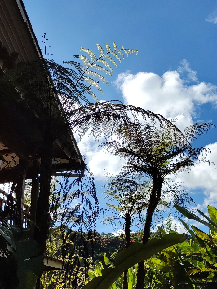 This image displays a lush outdoor scene in the city of Lán Tranh, Vietnam, under a bright blue sky with scattered white cumulus clouds. In the upper left quadrant, a section of a dark-colored building's corrugated roof and supporting wooden beams are partially visible, largely silhouetted. A large, bright green fern frond, backlit by the sun, arches upwards from the top-left corner. Below it, several darker fern fronds hang downwards, partially obscuring the building's lower structure. The midground features multiple tree ferns with dark trunks and rounded canopies of fronds, standing prominently against the sky. The lower foreground and mid-right contain dense, verdant foliage, including broad-leafed plants. In the background, a distant hillside covered in green vegetation is visible, with faint hints of red blooms. No individuals, actions, or interactions are present.