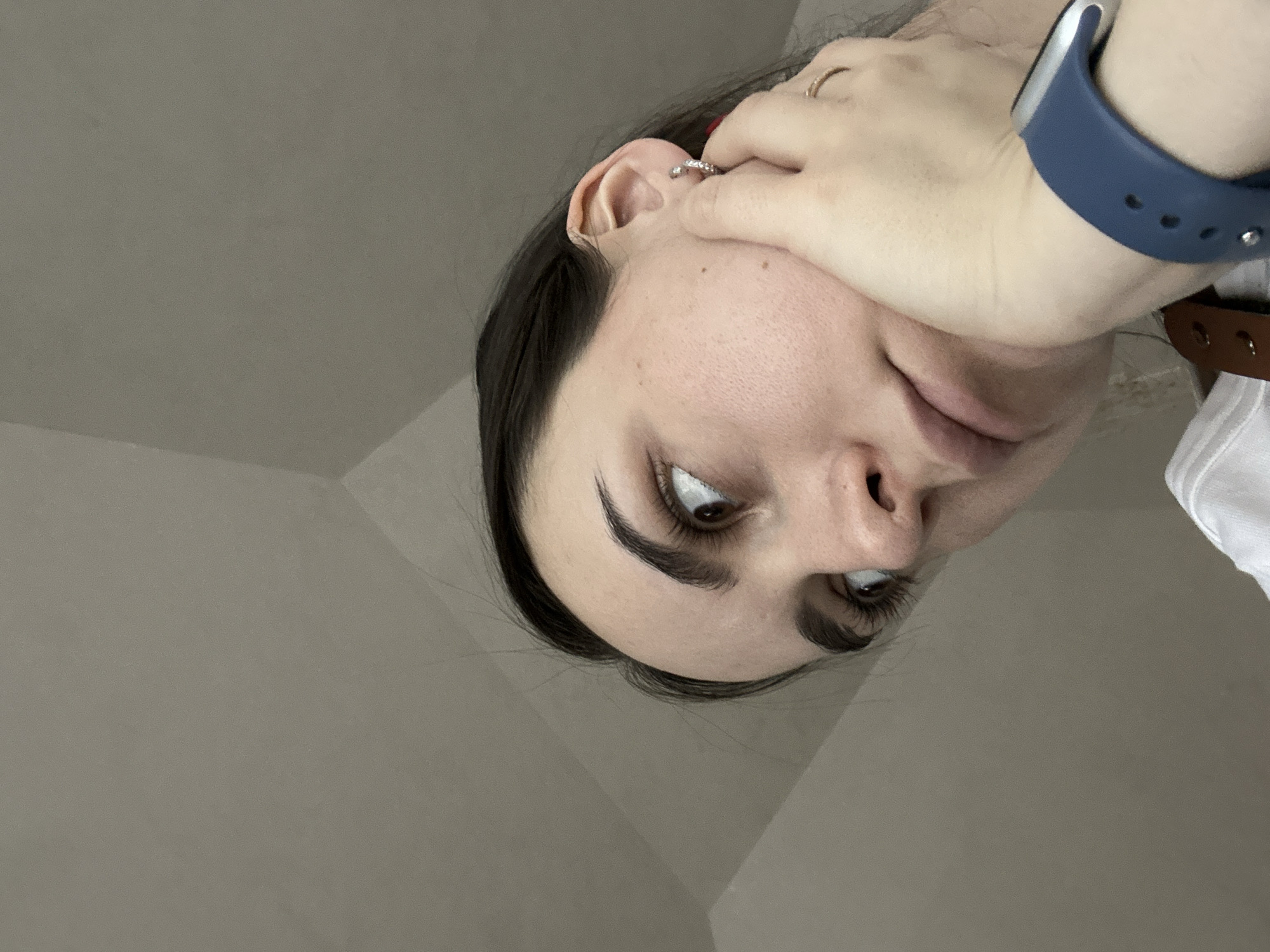 A close-up, angled shot focuses on a woman's face, partially obscured by her hand, which is adorned with a blue smartwatch. She is fair-skinned with dark hair pulled back. Her expression is difficult to read due to the angle. A silver earring is visible in her left ear. The background consists of neutral-toned walls. The location is poselok opytnogo khozyaystva "Yermolino," Russia.