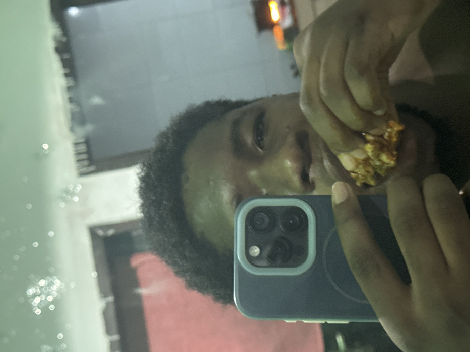 The image captures a reflected self-portrait of a dark-skinned individual with short, dark, curly hair. The subject holds a dark blue smartphone, featuring a triple-lens camera array and flash module within a light blue rectangular bezel, in their left hand, positioning it for the photograph. Simultaneously, their right hand grasps a piece of food, characterized by a textured, reddish-orange exterior, which is positioned at the subject's mouth. The background, visible as a reflection, contains scattered out-of-focus light sources across the upper portion. To the left, a blurred reddish vertical surface is present, while to the right, a darker vertical surface is observed. Further to the lower right, an indistinct object emitting orange and yellow light is reflected. The scene occurs in Ipetumodu, Nigeria, under ambient light conditions suggesting evening or night.