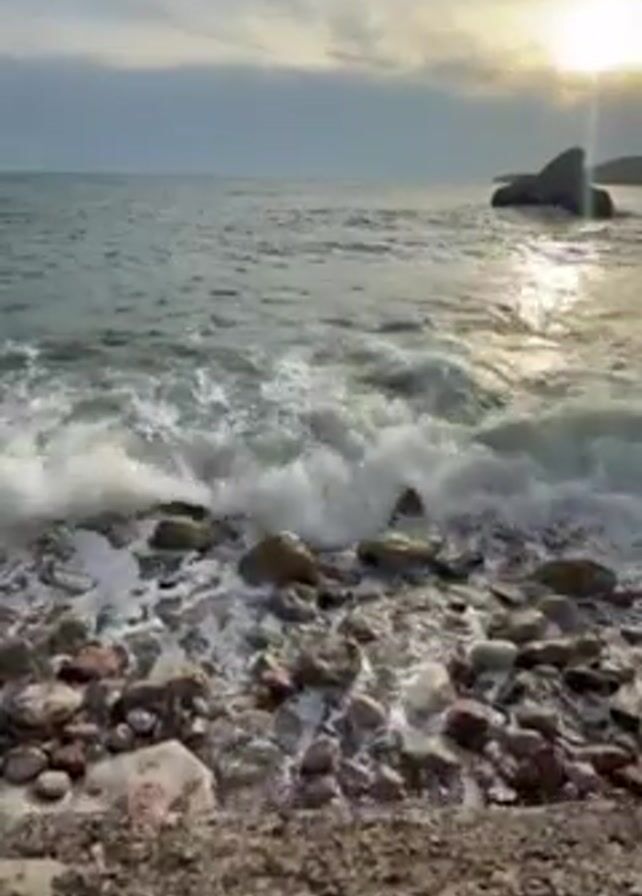 beach with a rocky shore and waves crashing against the rocks. The sun is shining through the clouds, creating a bright glare on the water. There is a large rock formation in the distance. The camera is positioned low to the ground, giving a close-up view of the waves.