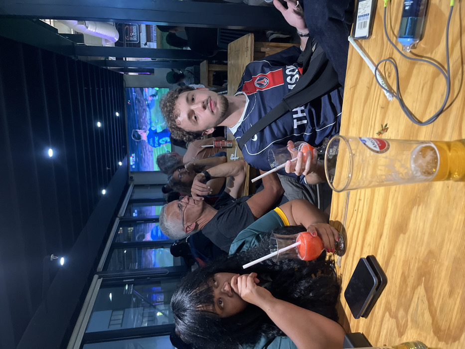 - "People sit at a wooden table in a bar with drinks" by FM-o9JMP2, licensed under CC BY 4.0