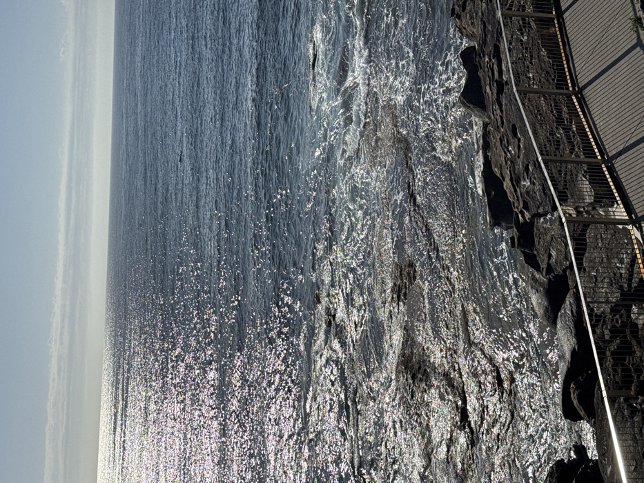 The image displays an ocean view, sparkling under sunlight, extending to a distant horizon. To the right, dark, rocky terrain meets the water, interspersed with a metal railing and boardwalk structure. The photograph is vertically oriented, giving emphasis to the expanse of water. The sky above the ocean is pale, adding to the overall brightness of the scene.