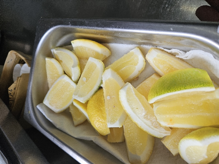 - "The image displays a close-up, overhead view of a rectangular, silver-colored metal pan, likely stainless steel, containing a quantity of freshly cut citrus wedges" by FM-yfXT73, licensed under CC BY 4.0