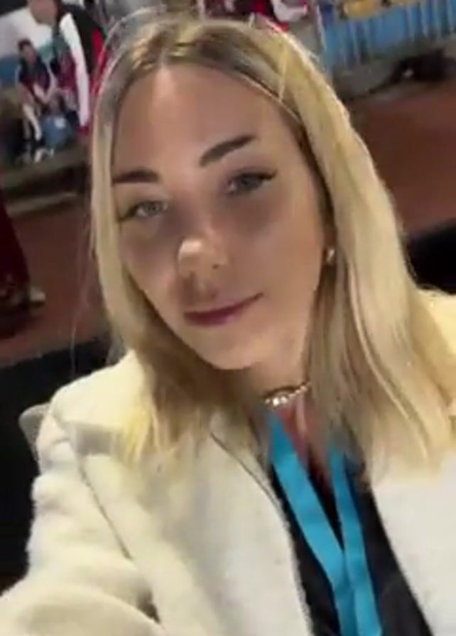 The video features a blonde woman taking a selfie at night. She is wearing a white jacket, a black top, a turquoise lanyard, and a pearl necklace. She has on makeup, including mascara and lip gloss, and pearl earrings. She briefly combs her hair with her fingers. The background is blurry, but appears to be an event space with other people and banners. The lighting is provided by overhead lights.