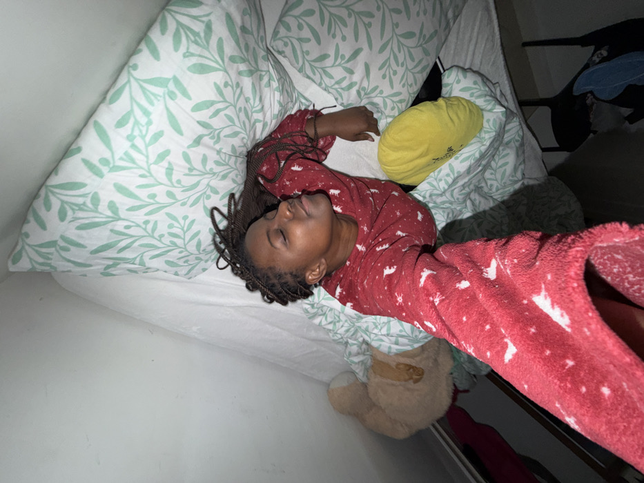 - "The image depicts a single individual, identified as a person with dark skin and braided hair, lying in a bed within an indoor domestic setting, presumed to be in Torrejón de Ardoz, Spain" by FM-dCvPY2, licensed under CC BY 4.0