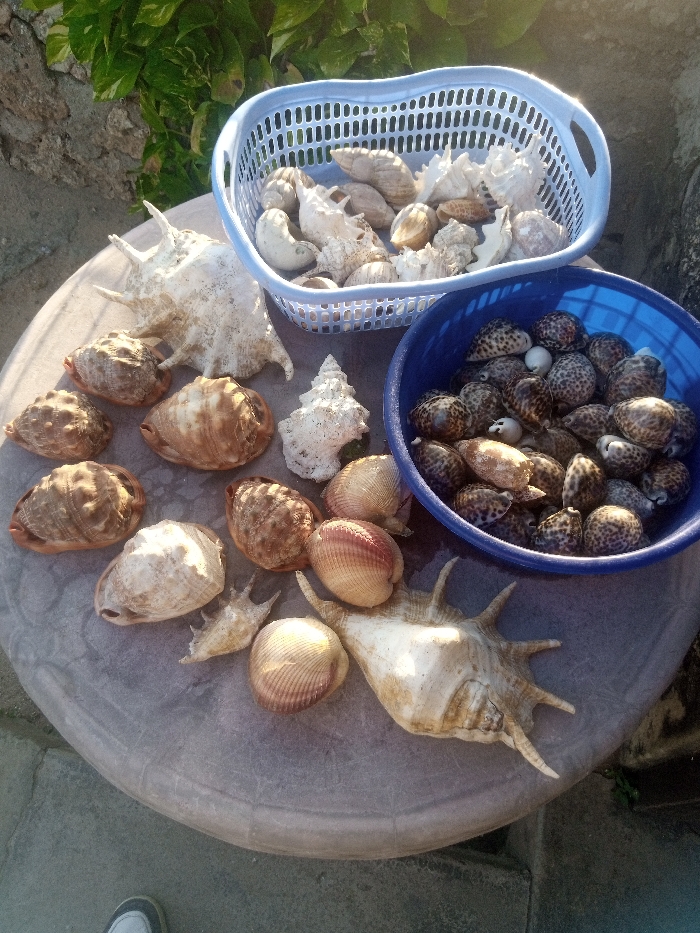 - "The image displays a diverse collection of seashells arranged on a circular, textured gray surface, likely a plastic table or stool, outdoors under natural light" by FM-vsiag2, licensed under CC BY 4.0
