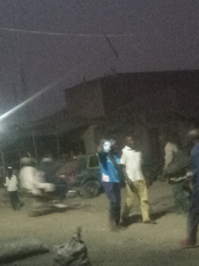 At night, a group gathers near a building with a protruding roof