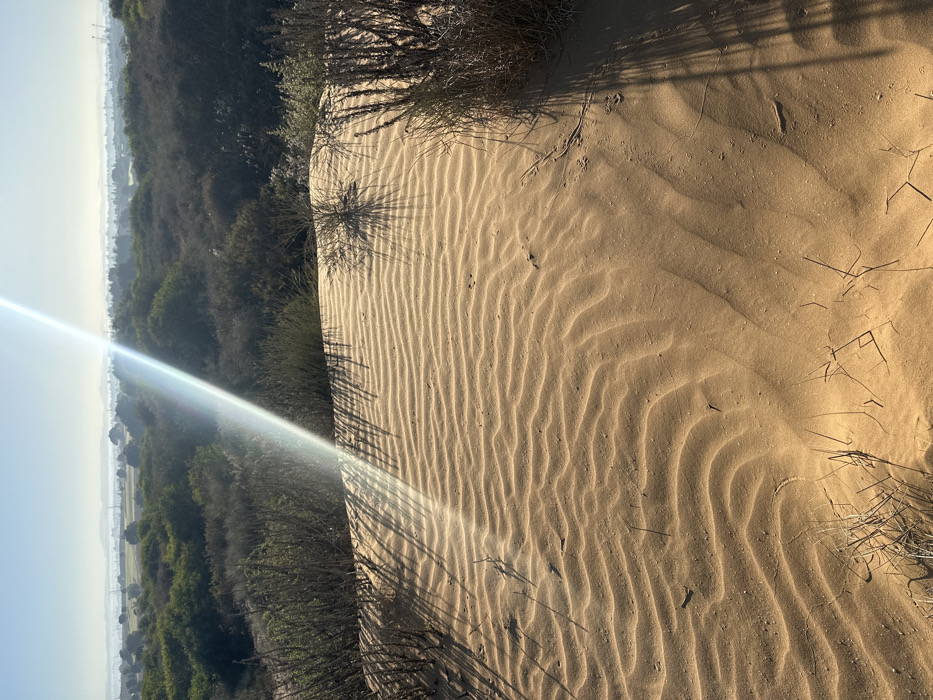 The image displays a sunlit natural landscape in Ga'ash, Israel. The foreground is dominated by a sandy dune surface exhibiting prominent, parallel ripple marks from wind activity. Scattered clumps of dry, sparse vegetation emerge from the sand, casting long, distinct shadows diagonally towards the viewer. A bright sun flare originates from the upper left, streaking across the frame. The midground consists of a dense, uncultivated area of green and brown scrubland and low-lying trees. In the hazy background, further vegetation is visible, including what appears to be a golf course with distinct green patches, and faint outlines of distant structures or utility lines beneath a clear blue sky. The lighting suggests early morning or late afternoon. No people, animals, or specific actions are present in the scene.