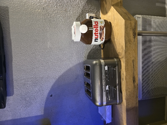 - "A large jar of Nutella is mounted on a wooden beam above a gray KitchenAid toaster" by FM-PPRef1, licensed under CC BY 4.0