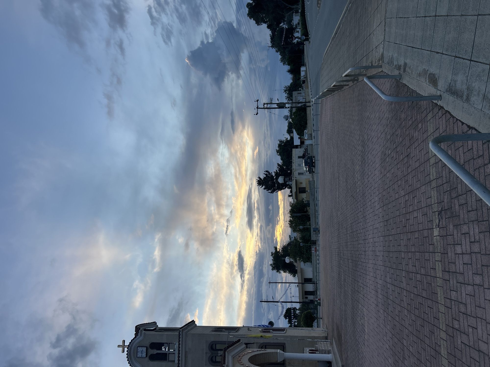 This image captures an outdoor scene in Dasaki Achnas, Sovereign Base Areas of Akrotiri and Dhekelia, observed during either dawn or dusk. The foreground consists of a grey concrete sidewalk with two curved metal handrails, adjacent to a wide plaza paved with reddish-brown interlocking bricks arranged in a herringbone pattern. To the left, a light-colored church bell tower rises, crowned with a golden cross, a visible clock face, and arched bell openings. The church's lower facade displays pillars and arches, with yellow and blue flags visible near an entrance. The midground features a two-lane asphalt road curving to the right, bordered by light-colored buildings and sparse vegetation, including trees and bushes. Utility poles carrying power lines and white decorative bunting are strung across this area. A dark SUV and other indistinct vehicles are parked on the far side of the road. The sky is largely cloudy, showing orange and yellow light near the horizon that fades into blue-grey overhead, punctuated by a prominent, irregular cloud formation on the far right. No individuals are present.