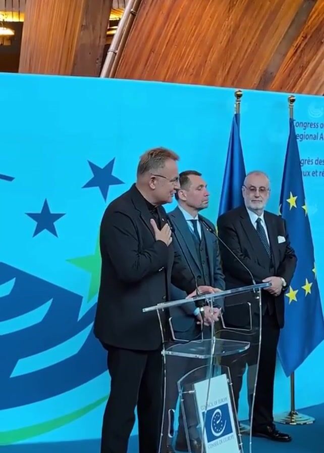 A man in a black suit is speaking at a podium. He has his hand on his chest. There are two men in suits standing behind him. There is a blue backdrop with stars and text, and two flags with yellow stars in the background. The podium is clear plastic with a symbol on the front.