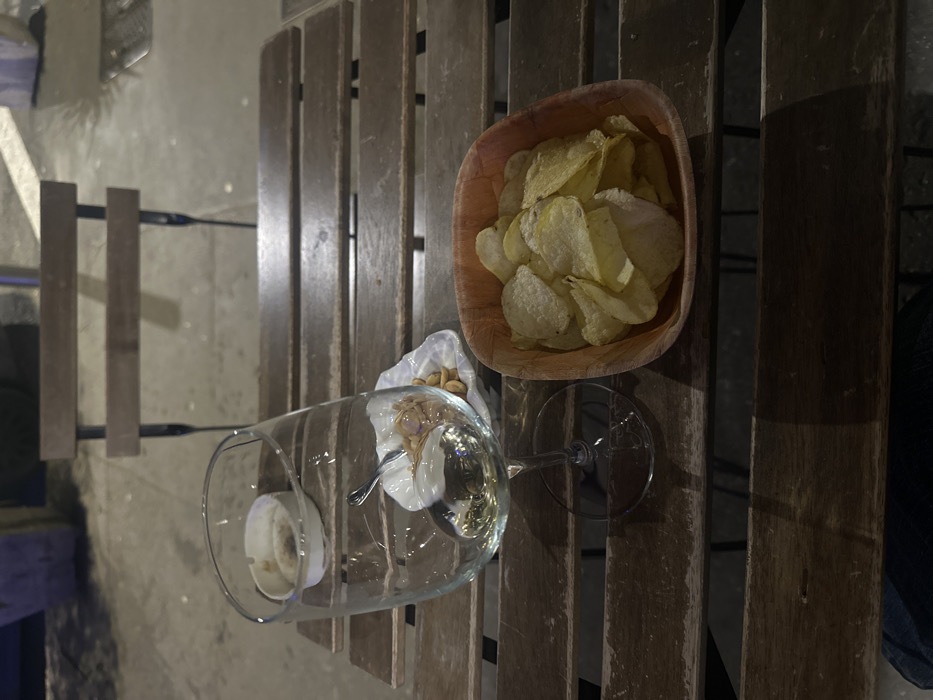 - "A top-down shot reveals a wooden plank table with a bowl of potato chips, a small dish of nuts, and a wine glass containing liquid" by FM-hAOA63, licensed under CC BY 4.0