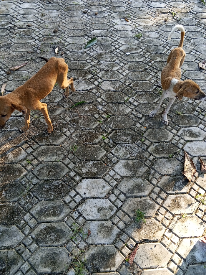 The image displays an outdoor paved area, reportedly located in Lokoja, Nigeria, though specific geographical markers within the city are not discernible from the visual evidence. The pavement is constructed from interlocking concrete blocks forming a repeating pattern of elongated octagons interspersed with smaller square-like units. The blocks exhibit signs of wear, discoloration, and scattered patches of green vegetation growing in the gaps between them. Numerous dried leaves and small debris are visible on the surface. Two slender, young dogs are present on the pavement. The dog on the left side of the frame is light brown or tan in color. Its head is lowered towards the ground, suggesting it is sniffing or investigating something. Its body is angled, with its front legs bent and hind legs extended backward. The dog on the right side of the frame is similarly light brown/tan with distinct white markings on its chest and possibly underbelly. This dog is in a partial play bow or stretch position, with its front legs extended forward and hind legs slightly bent. Its head is turned towards the right, away from the camera, and its tail is raised and curved over its back, featuring a white tip. Both dogs appear to be strays or unkempt, consistent with a street environment. Natural light illuminates the scene, casting soft shadows, indicating an outdoor daytime setting. No human subjects or interactions are visible.
