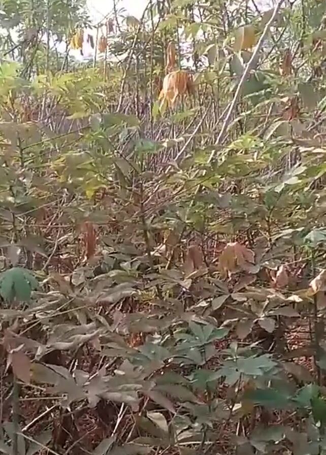 The camera is stationary, showing a field of cassava plants. The plants are a mix of green and brown, suggesting some of the leaves are dying or changing color. The field is dense, with the cassava plants obscuring the background. The sky is white and overcast.