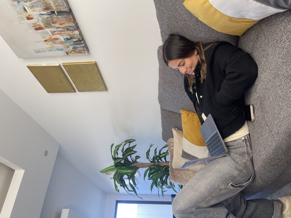 An indoor residential setting, specifically a living room, located in Zibatá, Mexico, is depicted. A female individual, appearing to be a young adult, is reclining on a multi-cushioned gray fabric sofa. She is dressed in a black long-sleeved jacket over a light-colored top and gray loose-fitting jeans. Her head is positioned to her right, resting against a sofa cushion, and she is looking down and to her left with a slight smile. A silver-colored laptop is open and resting on her upper thighs/lap. A dark-colored smartphone is placed on the sofa cushion next to her right hip. The sofa features several throw pillows, including solid yellow ones, a beige pillow with a gray and yellow geometric design, and a light brown furry pillow. The white wall behind the sofa displays two rectangular gold-colored panels mounted vertically and a larger abstract painting with a cityscape-like motif. To the far left, a tall potted plant with green leaves stands near a large, dark-framed window or glass door. The ceiling is white and includes recessed lighting.