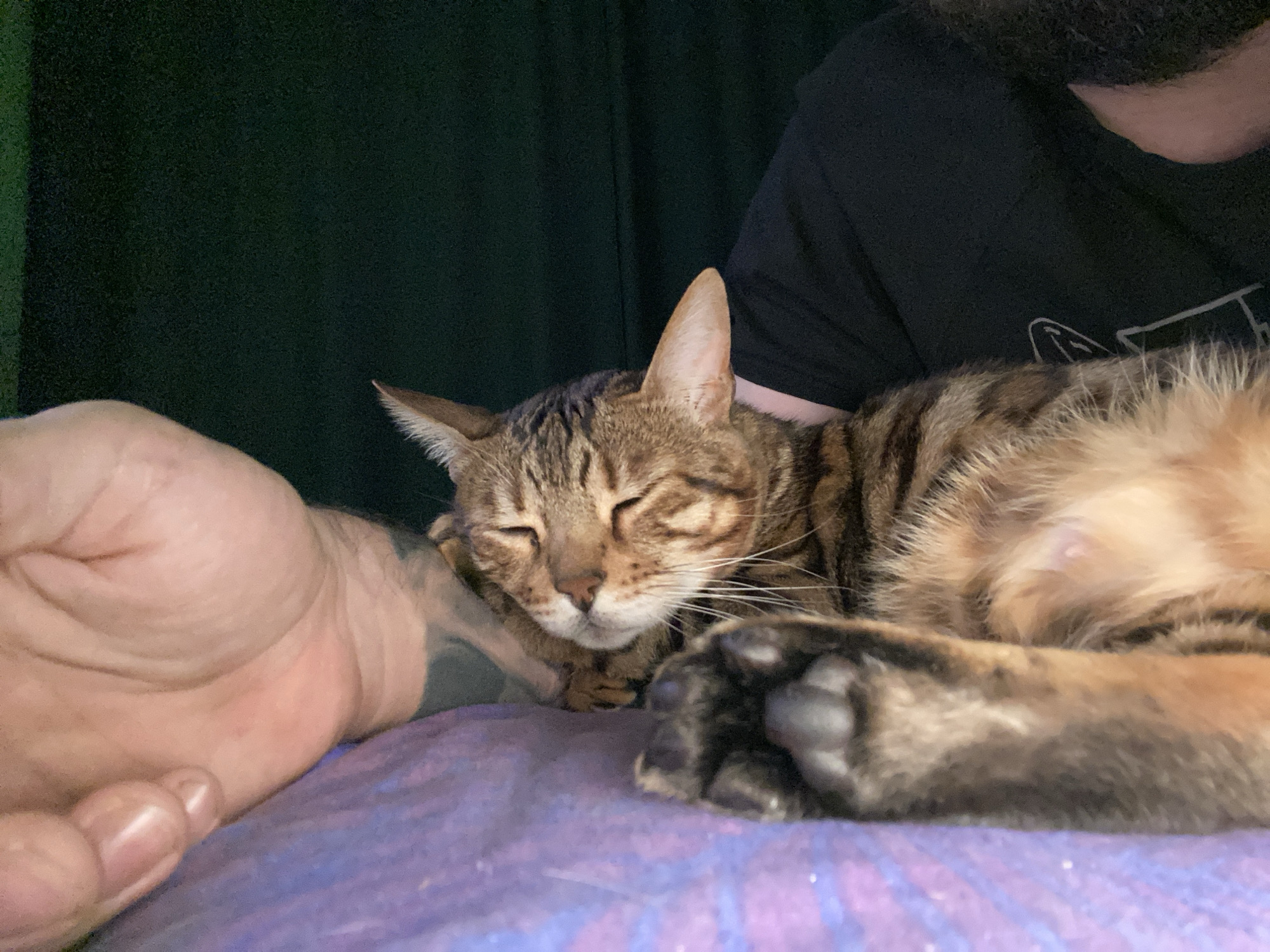 A tabby cat is sleeping on a patterned purple blanket. A human hand rests on the blanket near the cat's head. Part of a person wearing a black t-shirt is visible in the background. There is a dark green curtain in the background. The location is not discernible as Chaikovsky, Russia.