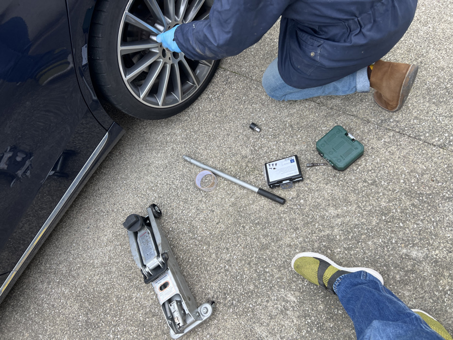 The image presents an overhead view of a car maintenance operation underway on a textured grey concrete or asphalt surface, located in Cherbourg-en-Cotentin, France. A dark-colored passenger vehicle, likely a sedan, occupies the upper right portion of the frame, exhibiting a silver trim strip along its lower body. The rear passenger-side wheel, a multi-spoke alloy design with a low-profile tire, is the central focus. A person, positioned on the right, is actively engaged with the wheel. This individual is seen from the waist down, wearing blue jeans with rolled-up cuffs, a dark blue work jacket or overall, and a brown suede boot on the visible right foot. Their right hand, encased in a light blue glove, is manipulating the lug nuts on the wheel hub. Arranged on the ground around the wheel are several tools and accessories: a silver hydraulic floor jack positioned away from the vehicle, a long silver lug wrench with a black handle, a small clear plastic cup containing numerous silver metallic items consistent with lug nuts, a black electronic device featuring a visible Mercedes-Benz logo, a single lug nut or specialized socket, and a closed green plastic toolbox/case, with a smaller tool bit resting nearby. The feet and lower legs of a second individual are visible on the lower left side of the frame, wearing blue jeans and a distinctive yellow-green mesh shoe with a black elastic strap across the instep and a white sole.