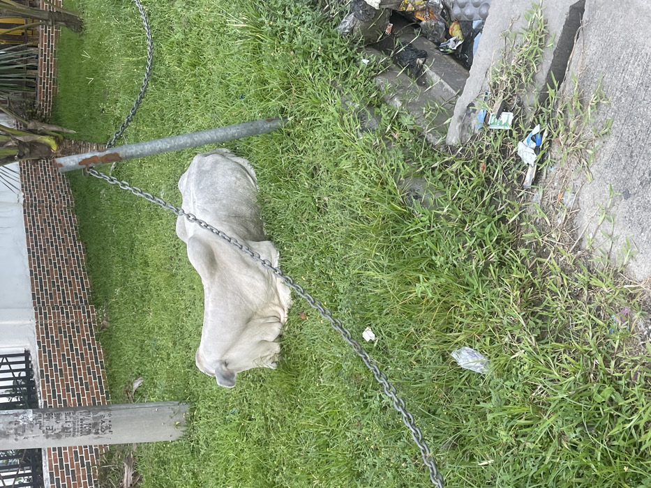 In Badore, Nigeria, a light-grey zebu-type cow is observed lying down on a vibrant green grass verge. The cow is positioned diagonally in the frame, facing left with its head resting on the ground, partially obscured by its dewlap. A metal chain runs across the scene, connected to a concrete utility pole on the left foreground and a slender, rusted metal post on the right, forming a barrier. The concrete pole displays faded paper notices with black text. To the immediate right of the grass verge, a concrete curb leads to a drainage ditch filled with miscellaneous refuse, including plastic bags and wrappers. The background features a building with a lower section composed of brown and black bricks, topped by a lighter-colored wall, along with some green foliage. No individuals are present.