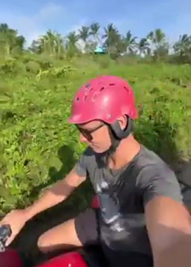A man wearing a pink helmet and sunglasses drives a red ATV on a dirt path surrounded by lush green vegetation. He is following a group of other ATVs that are further ahead on the path. The sky is blue and sunny. The man appears to be recording the video himself, using a handheld camera.