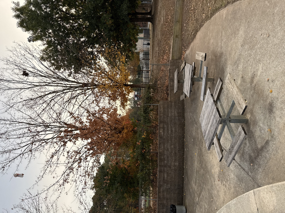 Two weathered picnic tables sit on a concrete patio next to a low brick wall. Beyond the wall, trees display autumnal colors. One tree is nearly bare, while others show hues of yellow and brown. A large green tree looms in the background. A black trash can stands near the wall. The sky appears overcast.