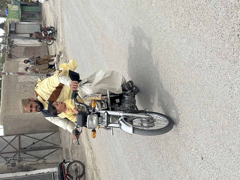 - "An adult male, approximately 35-45 years old, with a dark beard, wearing a light-colored shalwar kameez, a light-brown patterned shawl, and a light-brown cap, operates a silver and black "Shine Star" motorcycle with license plate "MAY 2940"" by FM-KEB4x1, licensed under CC BY 4.0