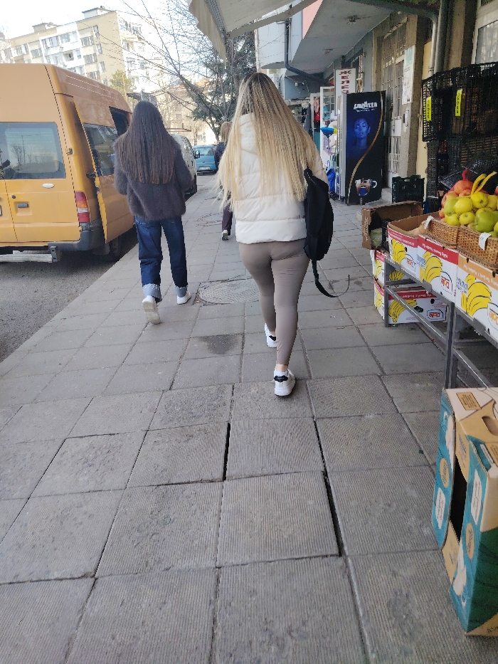The scene depicts a daytime urban street in Burgas, Bulgaria. Two individuals are walking away from the camera on a concrete-tiled sidewalk. The person on the right has long, straight, blonde hair, wears a white quilted vest, light brown leggings, and white sneakers with black heel details, carrying a black backpack on their left shoulder. The person on the left has long, dark brown hair, wears a dark, textured long-sleeved top, dark blue jeans with rolled cuffs, and white sneakers. The sidewalk is composed of square grey tiles, some exhibiting cracks and unevenness. A circular manhole cover is visible further along the path. To the left, a yellow panel van is parked on an asphalt street, with a light blue car visible in the distance. To the right, a commercial storefront features an outdoor display stand with baskets of various fruits, including red and green apples, atop metal shelving with cardboard boxes, some marked "banana," underneath. Adjacent to this is a tall, black vertical display unit for "LAVAZZA" coffee, featuring an illuminated image of a woman's face. Stacked dark crates are visible near the fruit display. In the background, multi-story buildings and bare tree branches are discernible under a clear sky. A partial view of a third individual's lower legs is visible between the two main subjects.