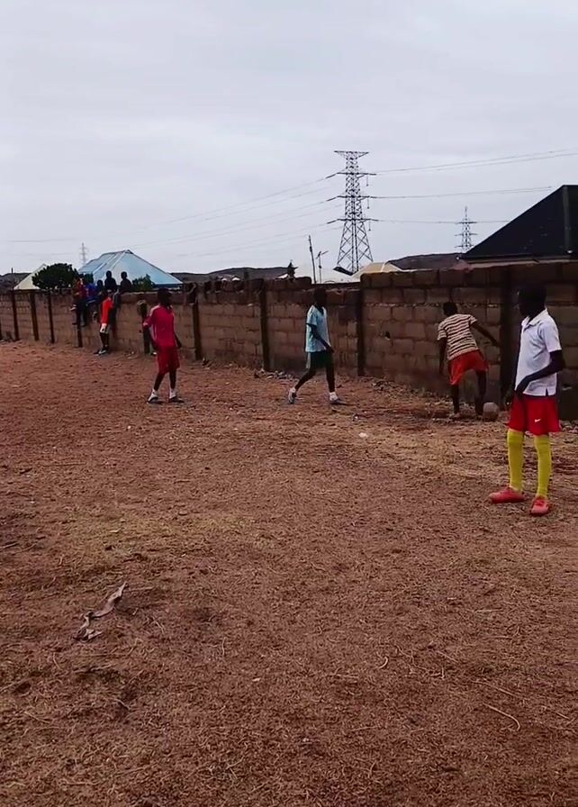 group of young people playing soccer on a dirt field. There's a low brick wall running along one side of the field, with houses and power lines visible in the background. The sky is overcast. The players are wearing various colored shirts and shorts. They are actively kicking and chasing the ball. The field surface is uneven and covered in reddish-brown soil.