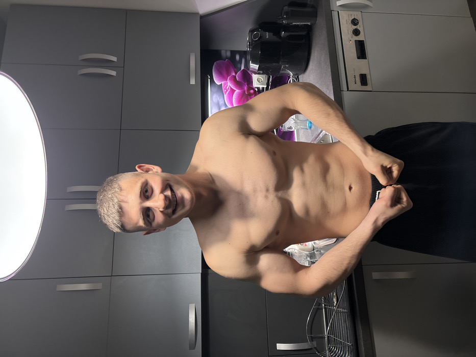 The scene depicts a physically fit young adult male posing in a modern kitchen located in Gabrovo, Bulgaria