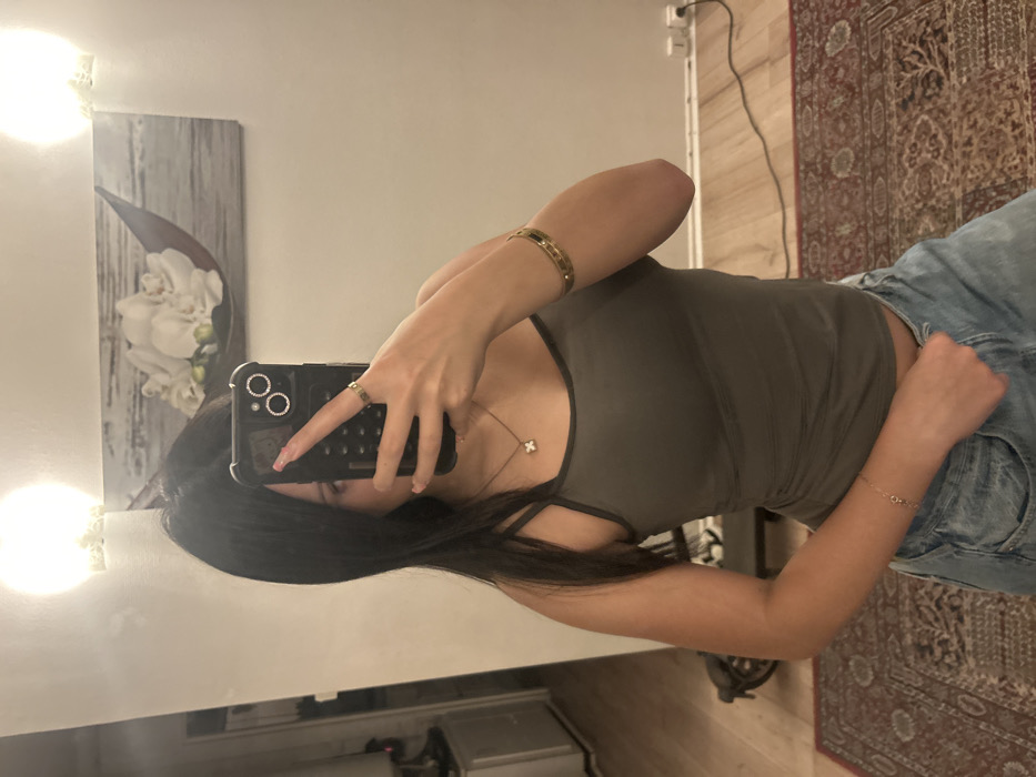 The image displays a female individual taking a mirror selfie indoors, ostensibly within a private residence in Strasbourg, France. The subject, centrally framed, possesses long dark hair and is clad in a dark olive green spaghetti strap tank top and light blue denim jeans. Her face is largely obscured by a black smartphone, featuring a multi-lens camera system with chrome-like accents and housed in a protective case, held in her right hand. Accessories include a gold-toned ring on her right index finger, a gold-toned bangle bracelet on her right wrist, and a delicate gold-toned chain bracelet on her left wrist. A gold-toned necklace with a white four-leaf clover pendant is visible at her sternum. The background features a light-colored wall illuminated by two bright wall sconces positioned high on the wall. Below these, a horizontal piece of wall art depicts white flowers, possibly orchids, in a dark, boat-shaped vessel. The floor consists of light-toned wooden planks, partially covered by a patterned rug displaying red, brown, and cream motifs. A white electrical outlet with a black cable connected is visible on the lower right wall. A blurred reflection on the mirror's left edge suggests a glimpse of an adjacent room with white cabinetry and an indistinct dark object on the floor.