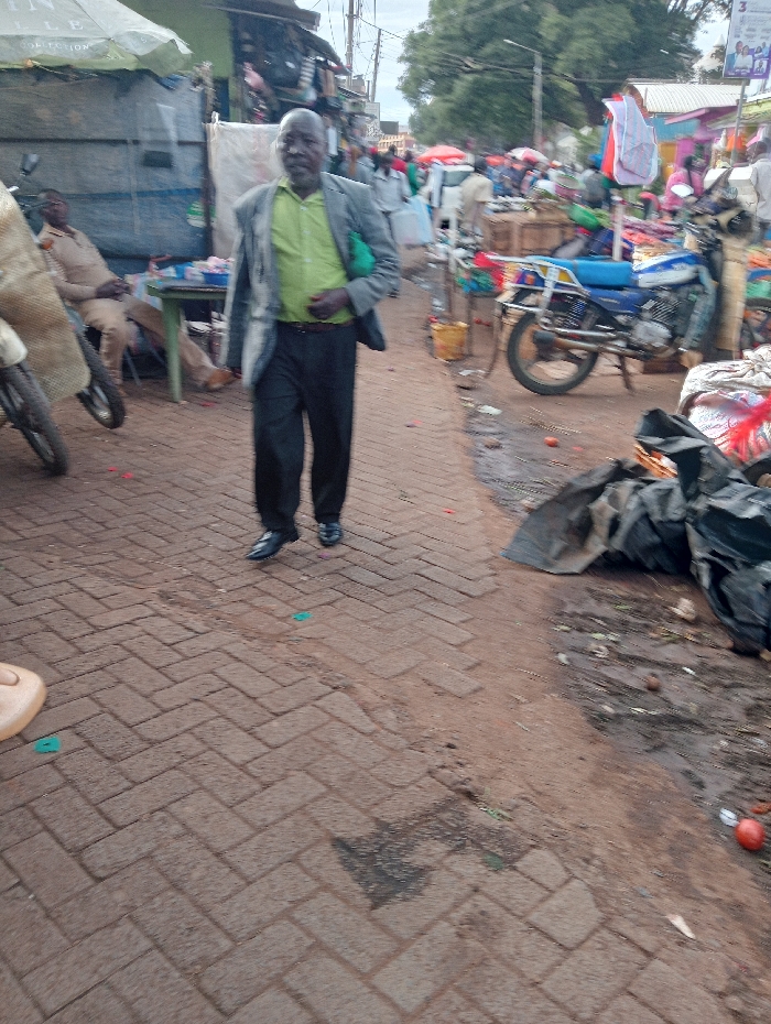 An older man in a grey blazer, green shirt, and black pants walks down a brick-paved street. He's surrounded by a bustling outdoor market with motorcycles, vendors, and shoppers. Bags of trash and debris are visible on the side of the road. The sky is overcast, suggesting a cloudy day.