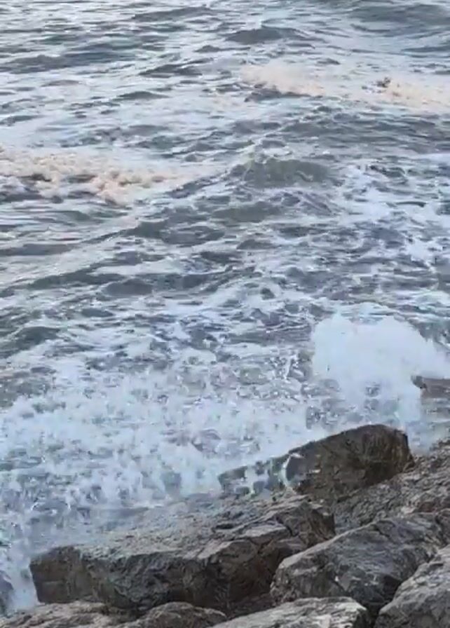 waves crashing against a rocky shoreline. The waves are a dark blue-gray color, with white foam where they break. The rocks are a mix of gray and tan. The water is turbulent and the waves appear to be moderately strong. There are no people visible in the video. The scene is set outdoors.