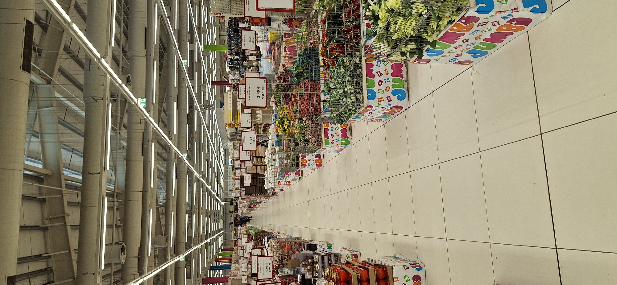 The image depicts the interior of a large retail store, specifically a Jumbo hypermarket located in Sofia, Bulgaria, identifiable by prominent "JUMBO" branding on aisle displays and price tags showing Bulgarian Lev and Euro currency. The scene presents a long, wide central aisle viewed from the front, extending deeply into the background. On the right side of the aisle, numerous rectangular wire-mesh bins are arranged in rows, each with a colorful "JUMBO" branded fabric skirt. These bins are filled with a dense assortment of artificial flowers and plants in various colors, including red, pink, yellow, green, and blue. Overhead, white price signs with red borders are suspended, displaying product names in Bulgarian and prices, such as "БУКЕТ ИЗКУСТВЕНИ ЦВЕТЯ" (Artificial Flower Bouquet) at 2.49 € / 4.87 лв. On the left side of the aisle, similar display structures hold various merchandise, including stacks of red ornamental candles or lanterns in the foreground. Further down the left aisle, other items are present, but less discernible. The floor is light beige tiled, featuring a grid pattern of dark grout lines and appears clean. The ceiling is high and industrial, with exposed gray metallic ductwork, structural beams, and numerous rows of long, white fluorescent tube lighting fixtures providing bright, uniform illumination. Several green emergency exit signs are visible mounted to the ceiling infrastructure. In the far background, several indistinct human figures, appearing as dark silhouettes, are walking further down the aisle. No specific actions or interactions between these individuals are discernible due to their distance and lack of detail. The overall environment is well-lit and organized, characteristic of a large discount retail establishment.